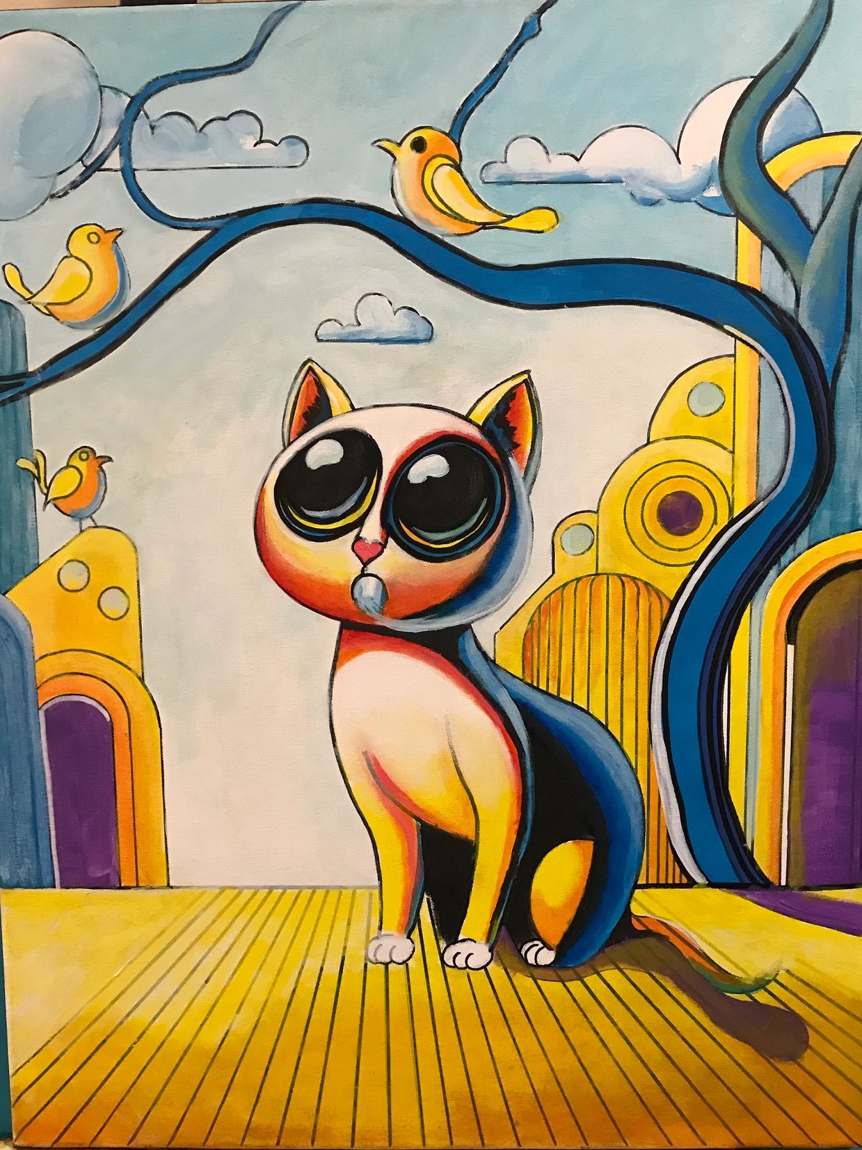 This painting feels like a reflection of patience and curiosity — the art of being still and watching life unfold. The cat’s wide, glossy eyes remind me that sometimes the greatest discoveries come from observation rather than action. The playful yellow birds symbolize fleeting inspiration, while the structured, dreamlike background suggests that even in our most imaginative spaces, there is order and purpose. Birdwatcher Kat is a gentle nudge to pause, breathe, and let the world surprise us.