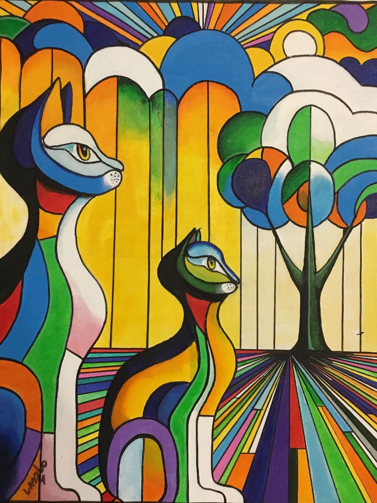This painting feels like stepping into a celestial sanctuary. The cats are regal and wise, as if they are timeless guardians of beauty and balance. The bold lines and radiant colors feel both powerful and calming, guiding the eye upward toward possibility and inward toward contemplation. Ethereal Katz is a tribute to the serenity found in stillness, the majesty of nature’s design, and the mystery of what lies beyond the visible — a piece that both grounds and uplifts the spirit.