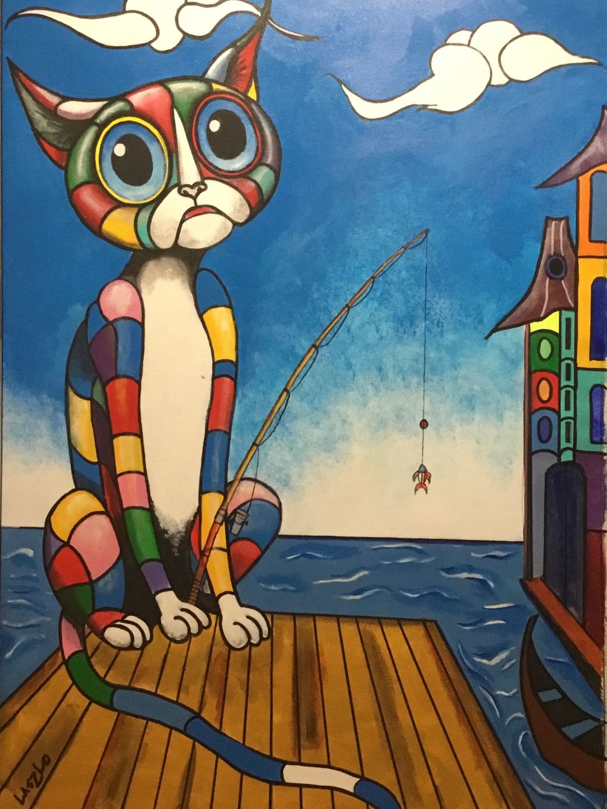 This painting feels like a playful meditation on hope, patience, and quiet anticipation. The brightly colored, patchwork cat seems both humorous and reflective, reminding me that sometimes even in vibrant, busy lives, we need to sit still and wait for life’s rewards to reveal themselves. Fisher Kat is more than a playful moment — it’s a reflection on the art of patience and the sweetness of dreams yet to be caught.