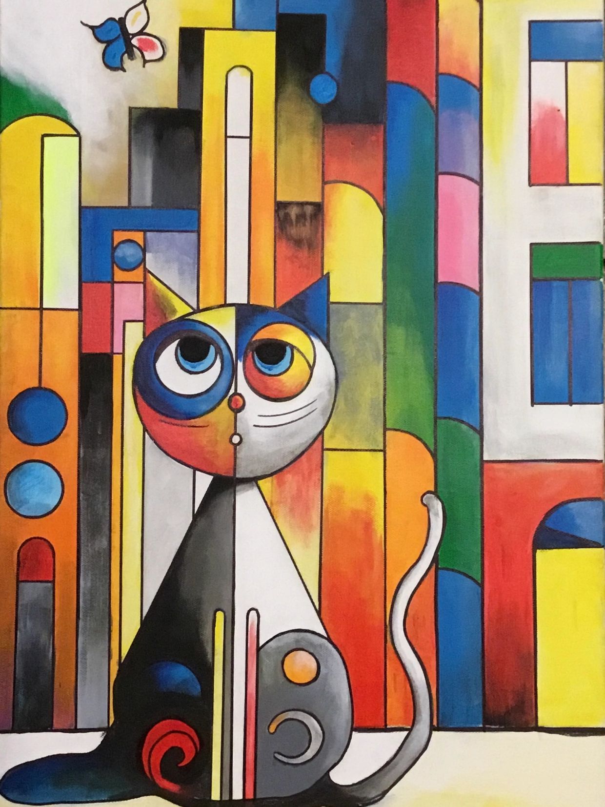 Googles the Kat is a vibrant cityscape brought to life through the bold, playful presence of a wide-eyed cat sitting tall against geometric urban architecture. The cat’s exaggerated circular eyes — reminiscent of googly eyes — create an innocent, curious expression that immediately captures attention. The cat’s body is a fusion of deep charcoal tones accented by splashes of crimson, cobalt, and gold, with elegant swirls and linear detailing adding sophistication to whimsy. Behind the cat, towering buildings constructed from brilliant color blocks and rounded window forms give the impression of stained glass against a soft, cloudy sky. Two butterflies flutter across the skyline, symbolizing freedom and lightness amidst city life’s structured beauty.