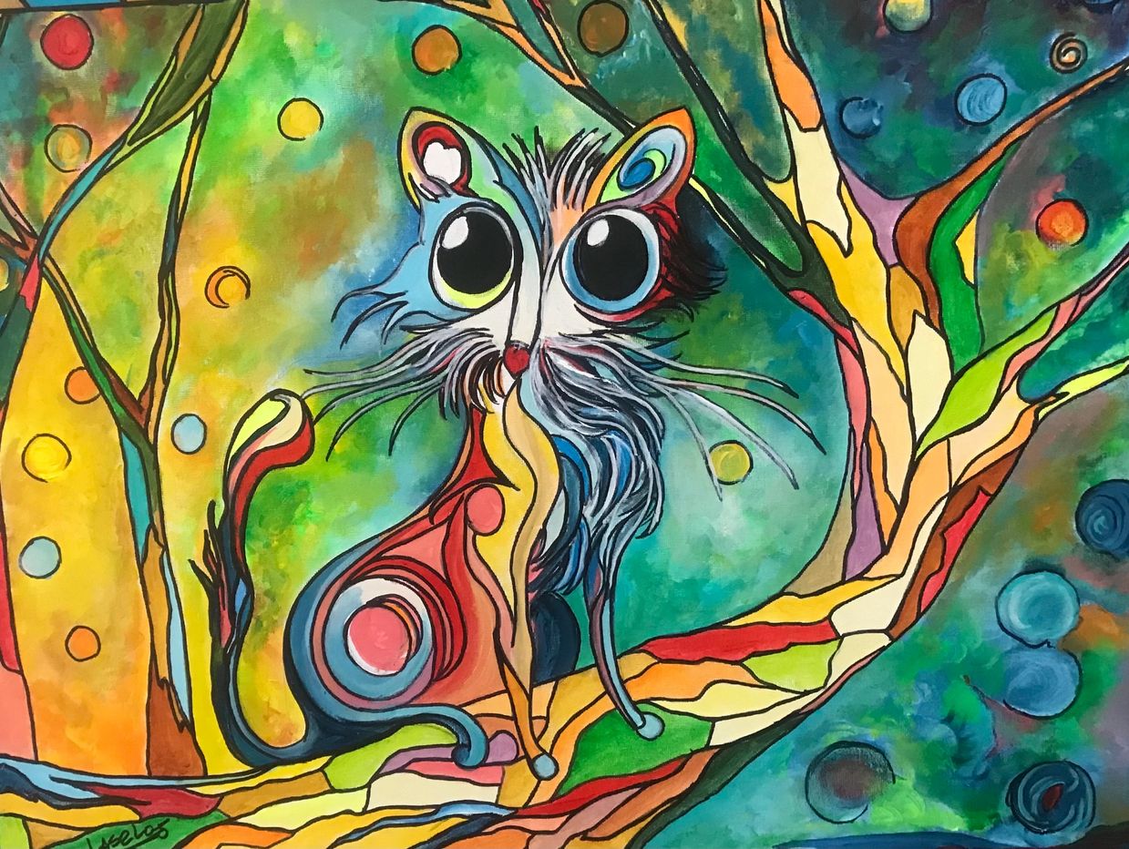 “Pepper the Kat” emerges from a kaleidoscopic forest, a surreal creature whose oversized eyes reflect both innocence and mystery. The composition blends stained-glass precision with free-flowing color, creating a balance between order and imagination. Every swirl, curve, and burst of pigment suggests motion and spirit, giving Pepper a personality that feels both playful and watchful.