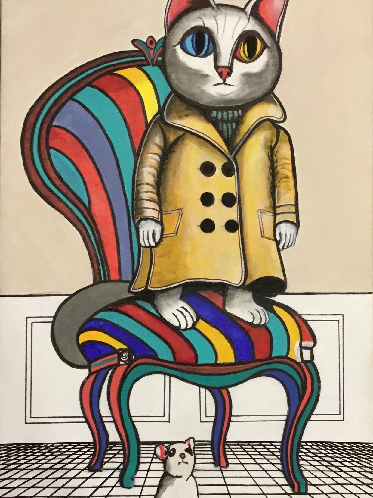 Scardy Kat captures a delightfully humorous and surreal moment frozen in time. A wide-eyed, elegantly dressed cat — clad in a tailored yellow trench coat — perches stiffly atop a vibrantly striped, ornate chair. Its mismatched, multicolored eyes convey both bewilderment and exaggerated caution, while below, a small, unimpressed mouse gazes upward with quiet confidence. The sharp contrast between the checkerboard floor and the playful, swirling rainbow patterns of the chair adds to the surreal, theatrical quality of the scene. The tension between the dignified cat’s obvious fear and the mouse’s composure flips the natural order, creating a whimsical narrative of vulnerability and reversal.
