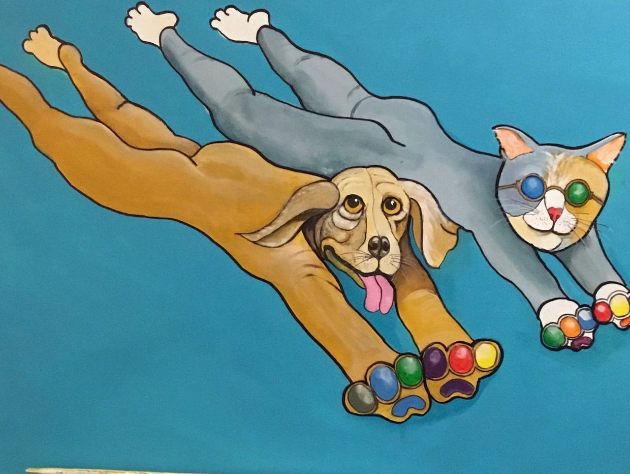The Great Escape captures a cat and dog soaring side by side across a vast expanse of blue, as if leaping into the skies of pure imagination. Their elongated bodies suggest motion and adventure, while their rainbow-colored paws become the central focal point—vivid symbols of playfulness, diversity, and joy. The dog’s floppy ears and eager expression radiate humor and loyalty, while the cat, sporting eccentric dual-colored glasses, embodies cool confidence and curiosity.